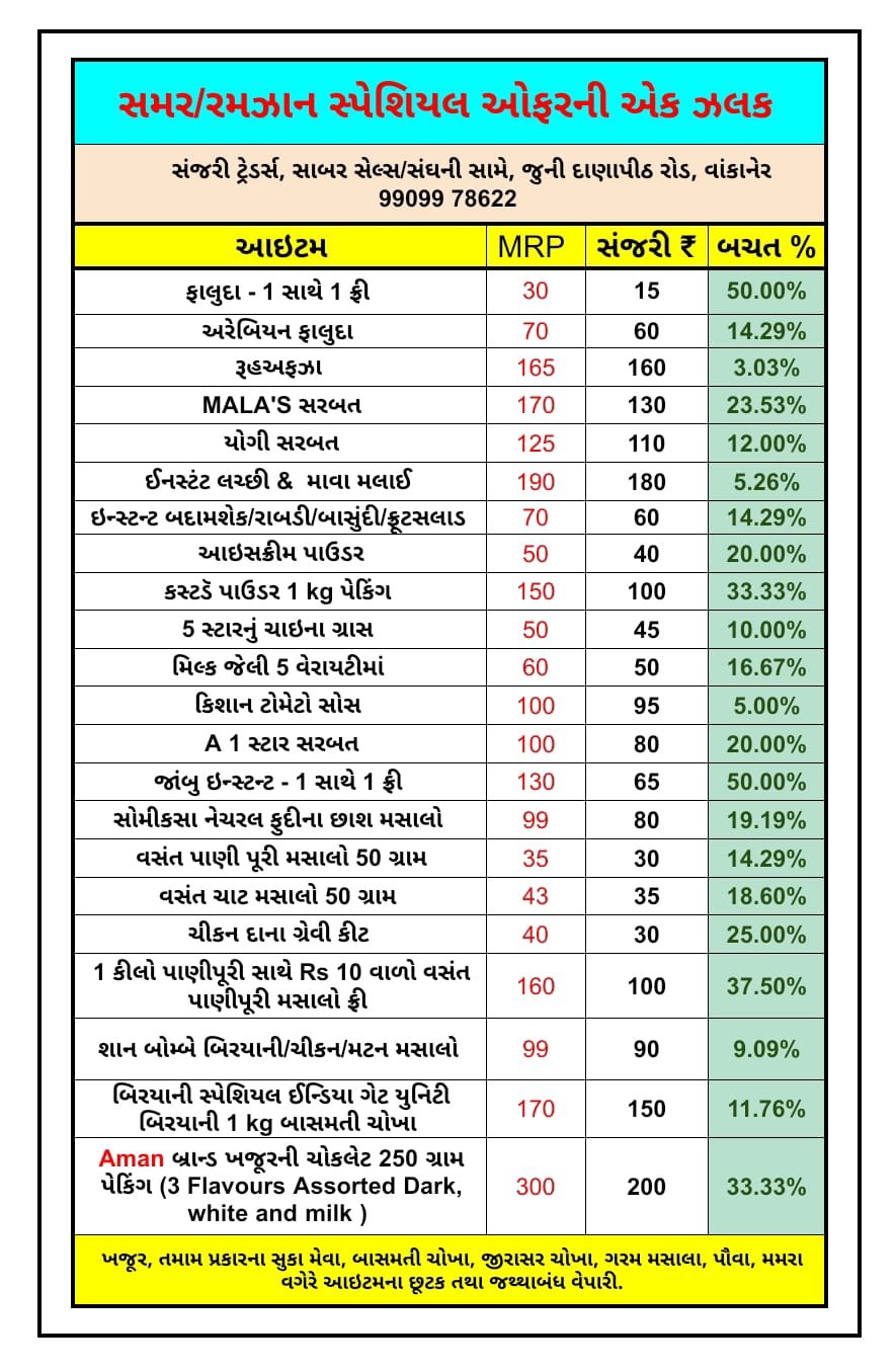 ગરમી અને પવિત્ર રમઝાન માસ નિમિત્તે સંજરી ટ્રેડર્સ તરફથી સમર & રમઝાન સ્પેશિયલ આઇટમો પર વિશેષ ડિસ્કાઉન્ટ ઓફરનો લાભ….