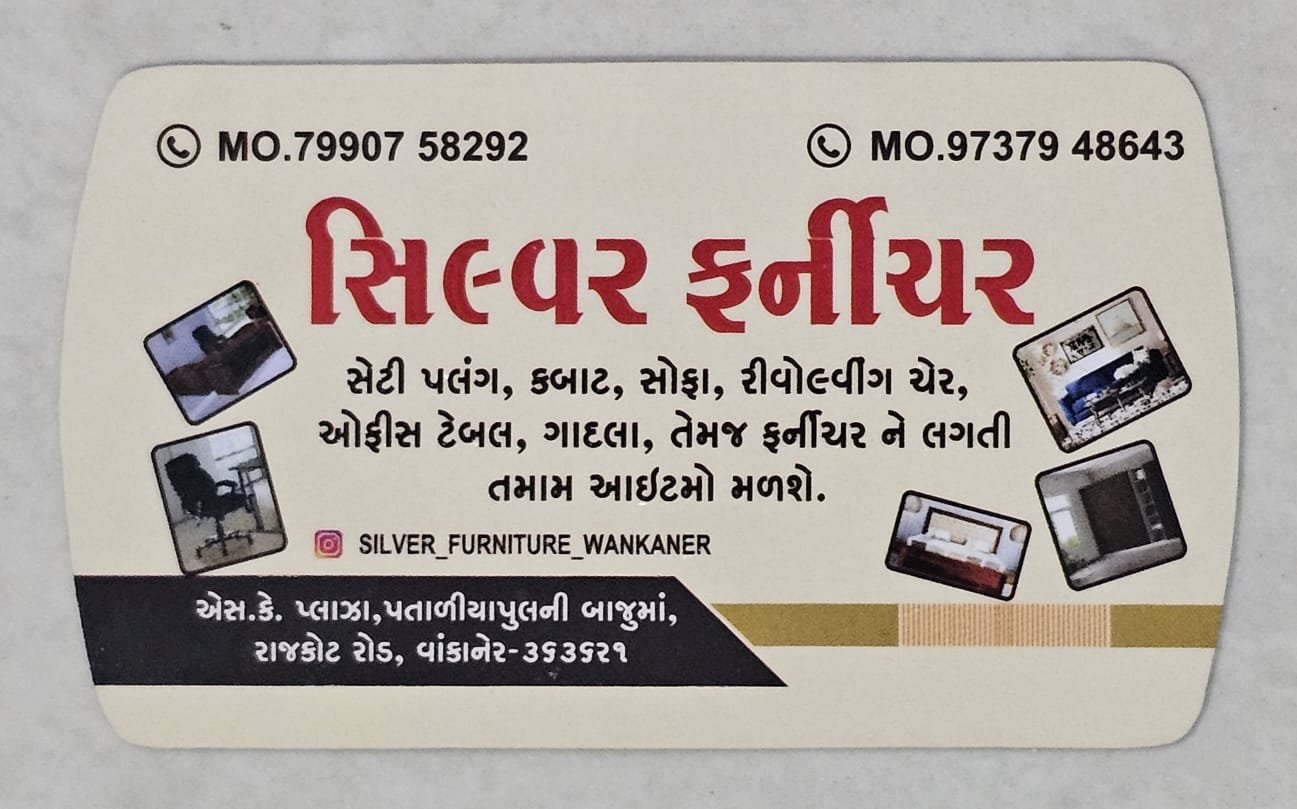 આ સાથે જ સિલ્વર ફર્નિચર શોરૂમ ખાતેથી ગ્રાહકોને 100% ગેરંટી અને વર્ષોના વિશ્વાસ સાથે સેટી, પલંગ, સોફા, રિવોલ્વિંગ ચેર, ઓફિસ ટેબલ, ગાદલા સહિત દરેક પ્રકારની ફર્નિચર આઇટમો હાજરમાં તેમજ આપની જરૂરીયાત મુજબ ઓર્ડરથી પણ બનાવી આપવામાં આવશે….