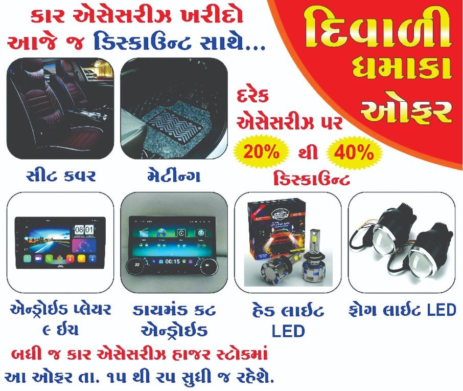 દરેક પ્રકારની કાર એસેસરીઝમાં દિવાળી તહેવાર નિમિત્તે તા. ૧૫ થી ૨૫ ઓક્ટોબર દરમિયાન 20 થી 40 % ડિસ્કાઉન્ટ ઓફરનો લાભ મળી રહેશે….