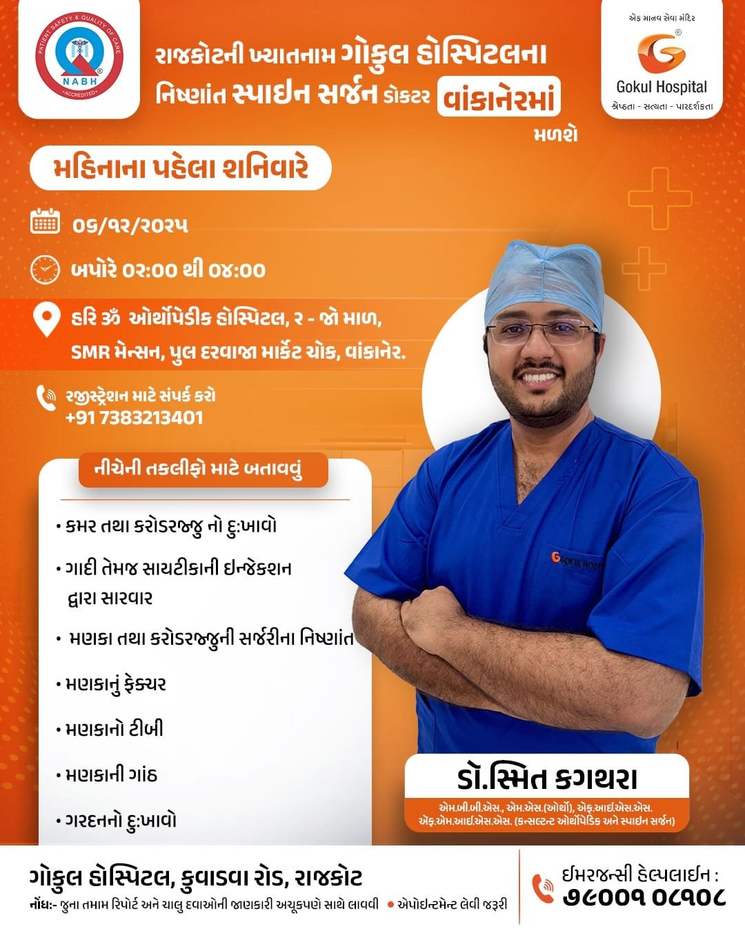 સ્થળ : હરીઓમ ઓર્થોપેડીક હોસ્પિટલ ; SMR મેન્સન, બીજા માળે, માર્કેટ ચોક, વાંકાનેર.