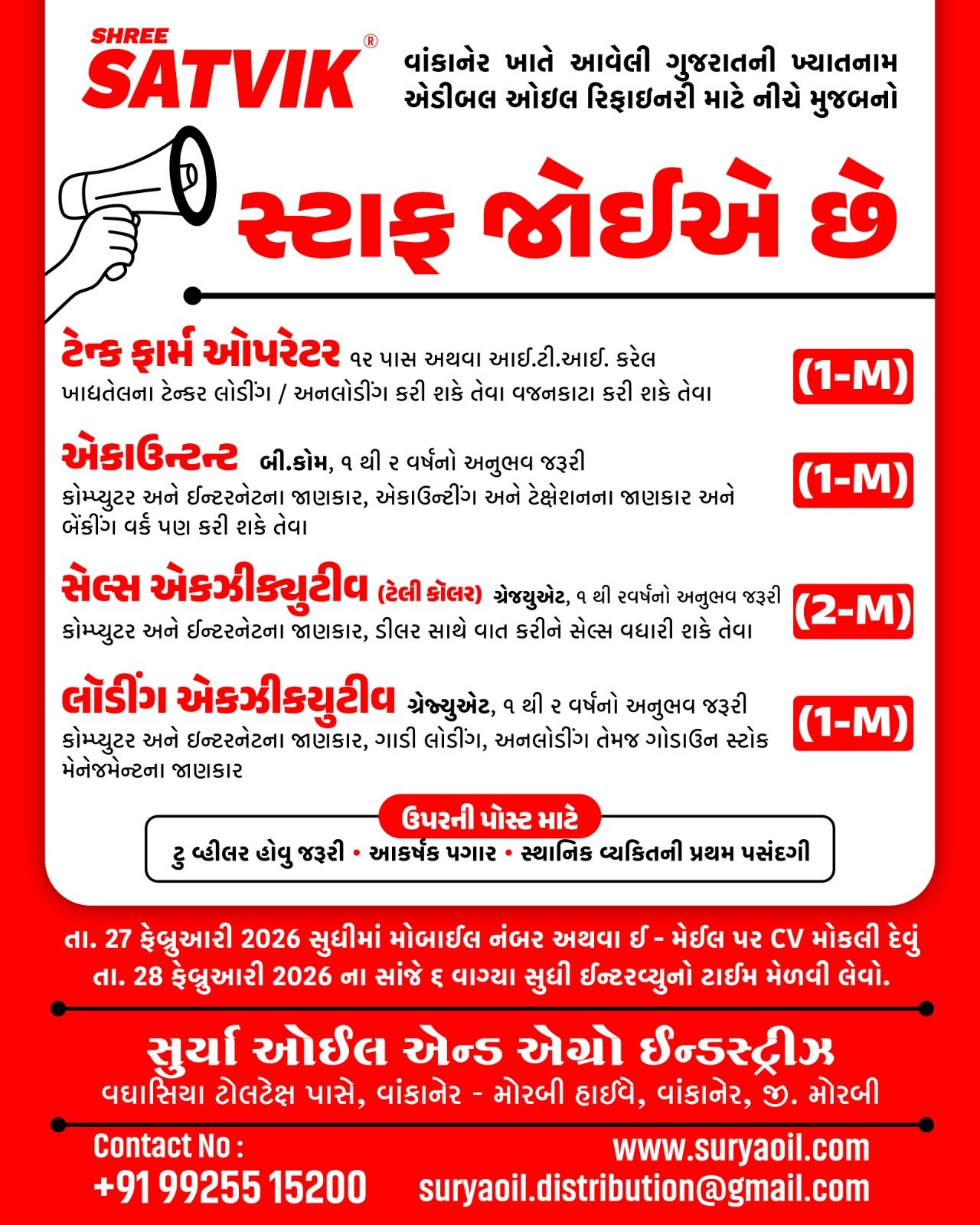 વાંકાનેર શહેર નજીક આવેલ ગુજરાતની નામાંકિત એડીબલ ઓઇલ રિફાઇનરી સુર્યા ઓઇલ એન્ડ એગ્રો ઇન્ડસ્ટ્રીઝમાં તાત્કાલિક ધોરણે વિવિધ જગ્યાઓ પર આકર્ષક પગાર ધોરણ સાથે સ્ટાફની ભરતી કરવાની હોય, જેથી રસ ધરાવતા ઉમેદવારોએ આગામી તા. 27 ફેબ્રુઆરી સુધીમાં પોતાનું રિઝ્યુમ નિચે આપેલ નંબર વોટ્સએપ અથવા ઈમેઇલથી મોકલવાનું રહેશે….