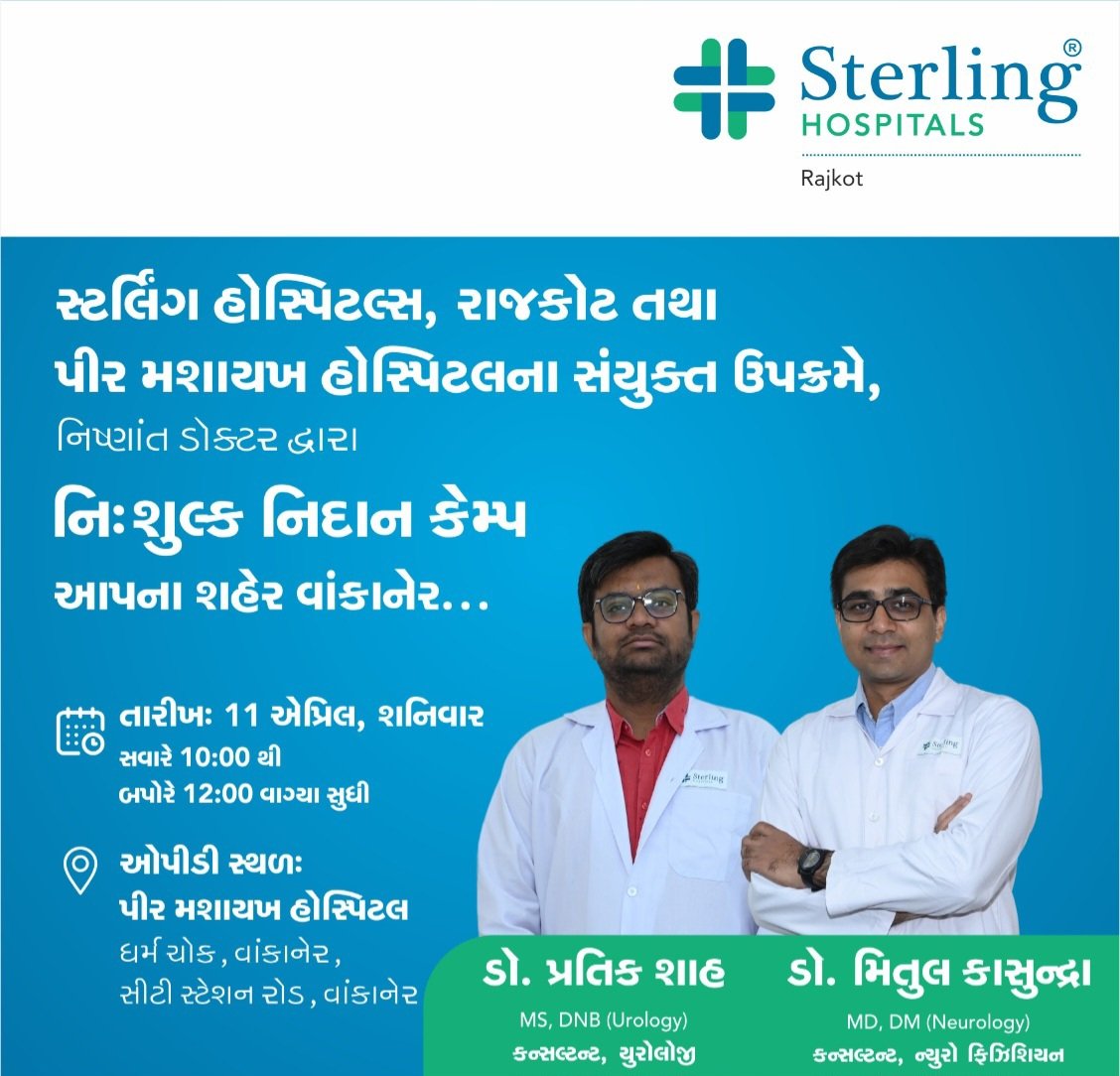 રાજકોટની નામાંકિત સ્ટર્લિંગ હોસ્પિટલ દ્વારા વાંકાનેરની પીર મશાયખ સાર્વજનીક હોસ્પિટલ ખાતે આગામી શનિવારના રોજ નિઃશુલ્ક નિદાન કેમ્પનું આયોજન કરવામાં આવ્યું છે, જેમાં સ્ટર્લીંગ હોસ્પિટલના કન્સલ્ટન્ટ યુરોલોજીસ્ટ ડો. પ્રતિકા શાહ (M.S. DNB, Urology) તથા કન્સલ્ટન્ટ ન્યુરો ફિઝિશિયન ડો. મિતુલ કાસુન્દ્રા (M.D. DM, Neurology) દ્વારા નીચે મુજબના રોગોનું સચોટ નિદાન કરવામાં આવશે, જેથી આ નિઃશુલ્ક નિદાન કેમ્પનો લાભ લેવા દર્દીઓને જણાવાયું છે….