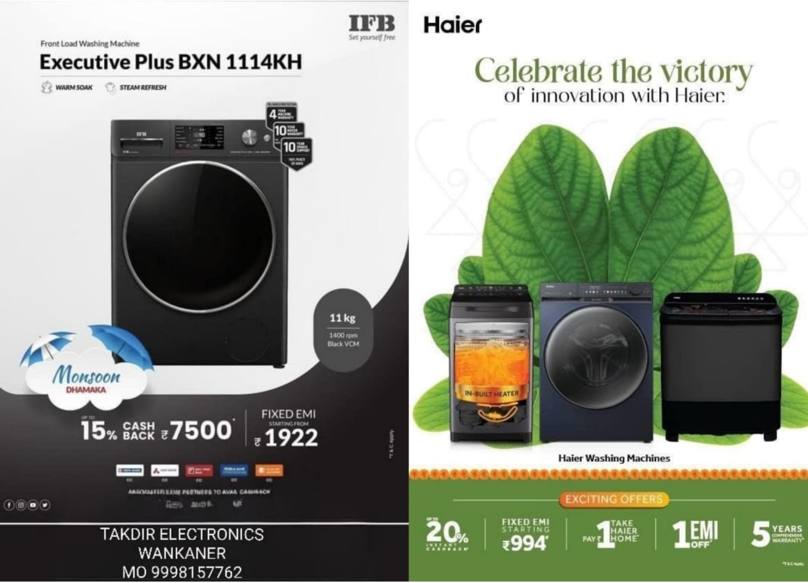 • હાયર કંપનીના ફ્રન્ટ લોડ વોશિંગ મશીન અને ટોપ લોડ હીટર વાળા વોશિંગ મશીન પર પાંચ વર્ષની ફુલ વોરંટી સાથે ક્રેડિટ કાર્ડ અને ફાઈનાન્સ પર ખરીદી પર સ્પેશિયલ કેશબેક ઓફર…