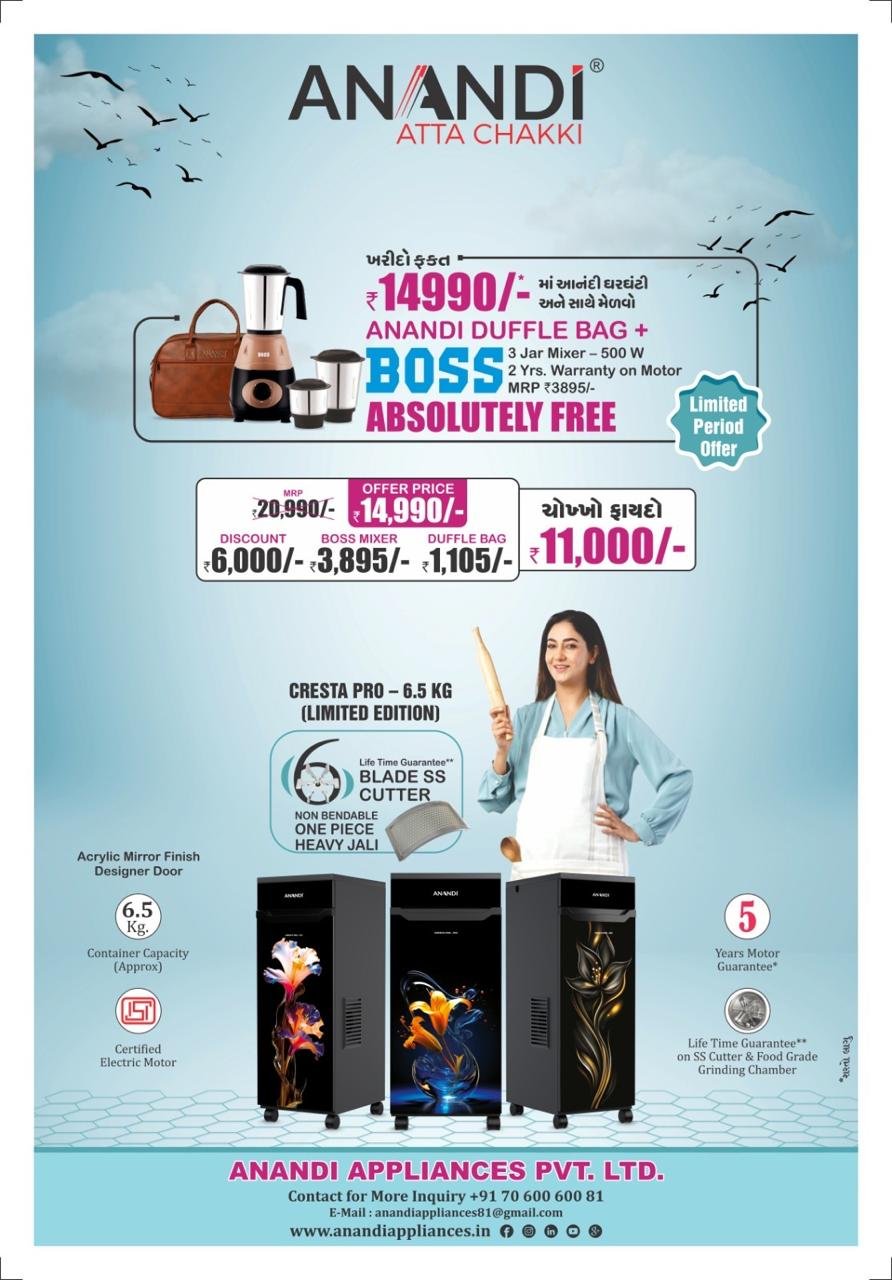 • આનંદી કંપની ઘરઘંટીની ખરીદી પર રૂ. 3,500નું બોસ કંપનીનું મિક્સર અને સાથે એક બેગ બિલકુલ ફ્રી…