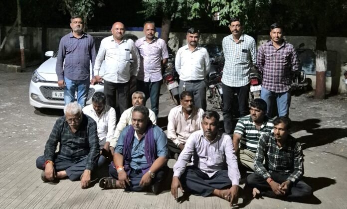 બનાવની પ્રાપ્ત વિગતો મુજબ વાંકાનેર તાલુકાના વરડુસર ગામની ખડીયા તરીકે ઓળખાતી સીમમાં વાડી ધરાવતા મૂળ વરડુસર અને હાલમાં રાજકોટ રહેતા આરોપી નાથાભાઇ લખમણભાઈ ડોડીયાએ પોતાની વાડીએ ઓરડીમાં બહારથી માણસો બોલાવી જુગાર રમવાના સાધનો પુરા પાડી નાલ ઉઘરાવી જુગાર ધામ ચલાવતો હોવાની બાતમીને આધારે વાંકાનેર તાલુકા પોલીસ ટીમ સ્થળ પર દરોડો પાડી જાહેરમાં જુગાર રમતા આરોપી ૧). નાથાભાઈ લખમણભાઈ ડોડીયા, ૨). હમીરભાઈ ગોંવિદભાઈ ડાભી, ૩). સનાભાઈ નરશીભાઈ ઝેઝરીયા, ૪). નાજાભાઈ છેલાભાઈ ડાભી, ૫). સુરેશભાઈ અરજણભાઈ ડાભી, ૬). સંજયભાઈ બીજલભાઈ ફીસડીયા (રહે. તમામ વરડુસર) ૭). ભીમાભાઈ ગોંવિદભાઈ ઓળકીયા અને ૮). દિગ્વિજયસિંહ નટુભા પરમાર (રહે. બંને ચુપણી તા.હળવદ)ને રોકડ રકમ રૂ. 97,020, આઠ મોબાઈલ ફોન તથા ચાર વાહન સહિત કુલ રૂ. 3,81,020ના મુદ્દામાલ સાથે ઝડપી પાડી ધોરણસરની કાર્યવાહી હાથ ધરી છે….