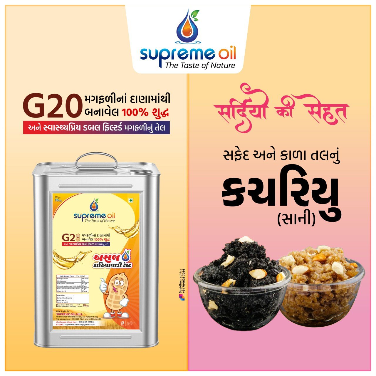 સુપ્રીમ ઓઇલ મીલ ખાતે વર્તમાન શિયાળાની ઋતુમાં આપનાં પરિવારજનો માટે એકદમ આરોગ્યપ્રદ અને સર્વશ્રેષ્ઠ ખોરાક એવા સફેદ તથા કાળા તલનું કચરિયું (સાની) કોઇપણ પ્રકારની મિલાવટ વગર સ્વાદિષ્ટ અને મજેદાર તાજુ કચરિયું, તેમજ તલનું તેલ ઓર્ડર મુજબ બનાવી આપવામાં આવશે….