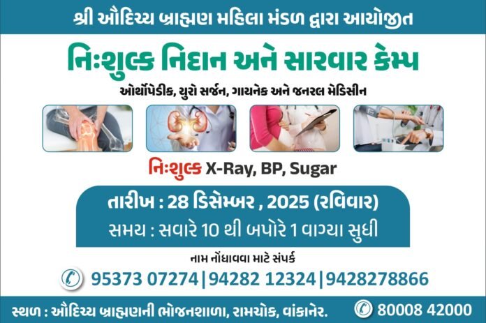 આ સાથે જ કેમ્પમાં દર્દીઓ માટે નિઃશુલ્ક X-Ray, બ્લડ પ્રેશર (BP) તથા શુગર ચેકઅપ જેવી તપાસ સુવિધાઓ પણ ઉપલબ્ધ રહેશે, જેથી સામાન્ય જનતા ખાસ કરીને જરૂરિયાતમંદ લોકો આ આરોગ્ય તપાસ કેમ્પનો લાભ લઈ શકે. કેમ્પમાં રજીસ્ટ્રેશન માટે મો. 95373 07274, 94282 12324 અથવા 94282 78866 પર સંપર્ક કરવા જણાવાયું છે….