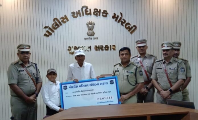 મોરબી જિલ્લા પોલીસ પરિવારે આ કપરા સમયમાં સ્વ. પ્રદિપસિંહના પરિવાર અને દસ વર્ષીય પુત્ર પ્રત્યે ગહન સંવેદના દાખવી આજરોજ રાજકોટ રેન્જ આઇ.જી. અશોકકુમાર યાદવ, એસ.પી. મુકેશ પટેલ, ડી.વાય.એસ.પી. સમીર સારડા તેમજ અન્ય તમામ અધિકારીઓ સહિત મોરબી જિલ્લાના પોલીસ સ્ટાફ દ્વારા સ્વ. પ્રદીપસિંહના પુત્રના શિક્ષણ માટે રૂ. 8,61,311ની આર્થિક સહાયનો ચેક અર્પણ કરવામાં આવ્યો હતો…