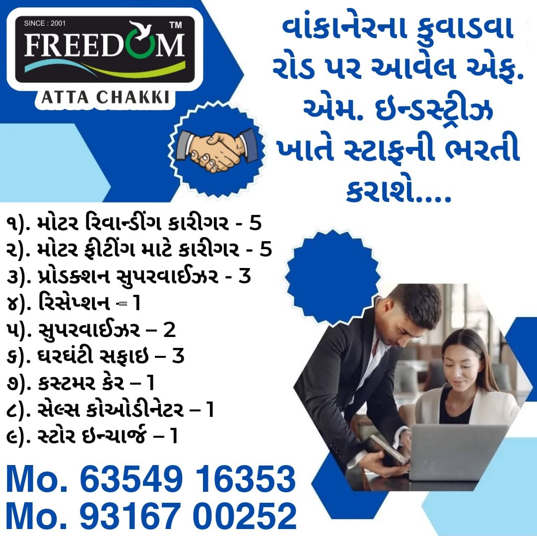 વાંકાનેર-કુવાડવા રોડ પર જીયાણા નજીક આવેલ દેશની નામાંકિત પ્રથમ હરોળની ઘરઘંટી ઉત્પાદક કંપની એફ. એમ. ઇન્ડસ્ટ્રીઝ ખાતે તાત્કાલિક ધોરણે ઉચ્ચતમ પગારધોરણ સાથે વિવિધ જગ્યાઓ પર સ્ટાફની ભરતી કરવાની હોય, જેથી નિચે આપેલ જગ્યાઓ માટે યોગ્ય લાયકાત ધરાવતા ઉમેદવારો તાત્કાલિક નીચે આપેલ નંબર પર સંપર્ક કરવો…