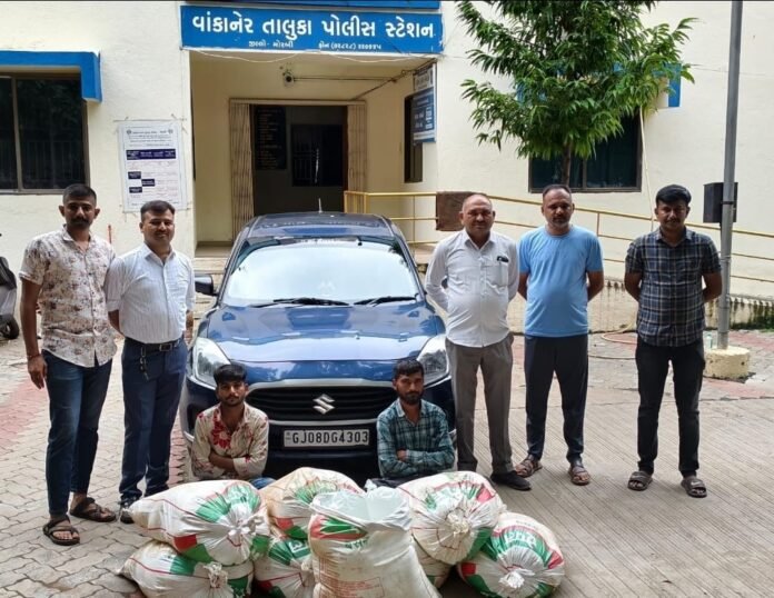 વાંકાનેર તાલુકા પોલીસ ટીમ દ્વારા ચોક્કસ ખાનગી બાતમીના આધારે વાંકાનેરના કોઠી ગામના બોર્ડ પાસે નેશનલ હાઇવે પર દ્વારકાધીશ હોટલ પાસે વોચ ગોઠવી બાઉન્ડ્રી તરફથી આવતી એક સ્વીફ્ટ ડિઝાયર કાર નં. GJ 08 DG 4303 ને રોકી તલાસી લેતા કારમાંથી 400 લીટર દેશી દારૂ (કિંમત રૂ. ૮૦,૦૦૦)નો જથ્થો મળી આવ્યો હતો, જેથી પોલીસે આ બનાવમાં કાર ચાલક વિપુલભાઈ મુકેશભાઈ વરાણીયા (રહે. એસાર પેટ્રોલ પંપ પાછળ, ત્રાજપર) અને બરકતશા અલીશાભાઈ શાહમદાર (રહે. એલ.ઈ. કોલેજ રોડ, મોરબી)ની દેશી દારૂ તથા કાર સહિત કુલ રૂ. 5,80,000ના મુદ્દામાલ સાથે ધરપકડ કરી ધોરણસરની કાર્યવાહી હાથ ધરી હતી…
