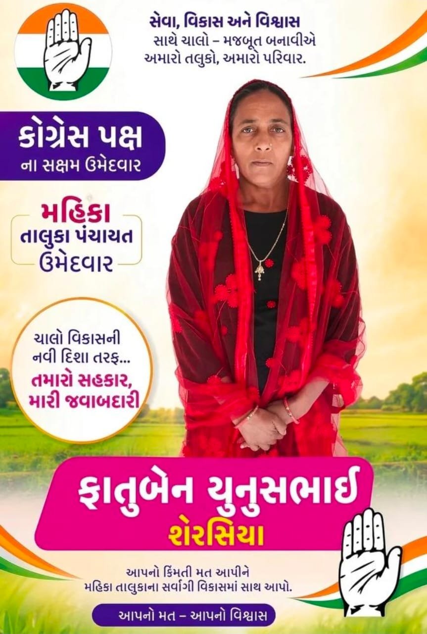 વર્ષોથી લોકસેવા સાથે સંકળાયેલા યુનુસભાઈ શેરસીયા અને ફાતુબેને પોતાના કાર્યકાળ દરમિયાન કરેલા કામોથી બહોળી લોકચાહના મેળવી છે. હાલમાં જ્યારે ફાતુબેન મહિકા તાલુકા પંચાયત સીટ પર કોંગ્રેસના ઉમેદવાર તરીકે મેદાનમાં છે, ત્યારે મતદારો દ્વારા તેમનું ઉષ્માભેર સ્વાગત કરવામાં આવી રહ્યું છે. જનસંપર્ક દરમિયાન મળતા અભૂતપૂર્વ પ્રતિસાદને પગલે આગેવાનો અને કાર્યકરોમાં એવો દ્રઢ વિશ્વાસ વ્યક્ત કરવામાં આવી રહ્યો છે કે આ વખતે ફાતુબેન ગત ચૂંટણી કરતા પણ મોટી લીડ સાથે વિજય પતાકા લહેરાવશે….