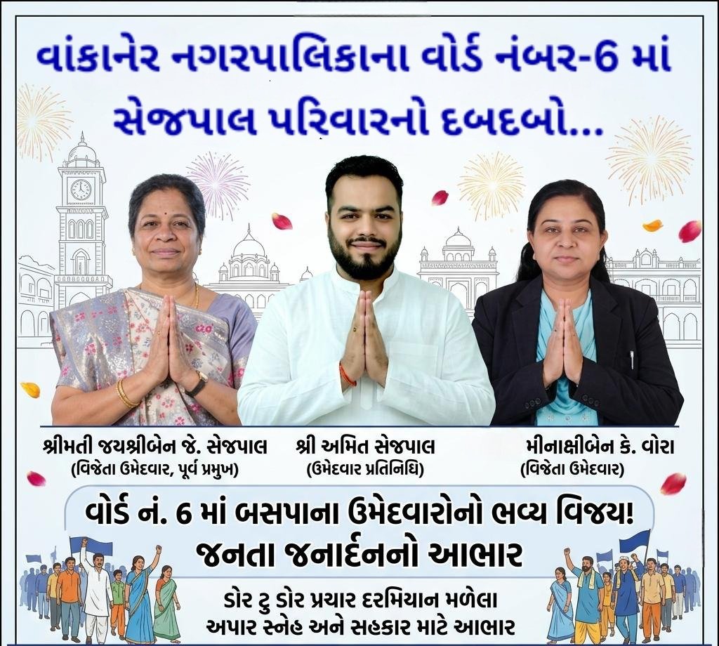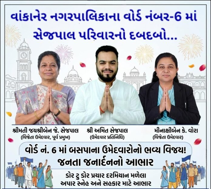 વાંકાનેર નગરપાલિકાની ચૂંટણીના પરિણામો જાહેર થતાં જ વોર્ડ નંબર 6 માં બહુજન સમાજ પાર્ટી (BSP)ના ઉમેદવારોએ ભવ્ય વિજય પતાકા લહેરાવી દીધા છે. આ ઐતિહાસિક જીત સાથે જ વાંકાનેરના રાજકારણમાં સેજપાલ પરિવારનો દબદબો અને લોકચાહના યથાવત રહ્યા હોવાનું ફરી એકવાર સાબિત થયું છે. જંગી બહુમતીથી વિજેતા બનેલા બસપાના ઉમેદવારો અને તેમના ટેકેદારોએ વોર્ડની જનતા જનાર્દનનો હૃદયપૂર્વક આભાર વ્યક્ત કર્યો હતો…