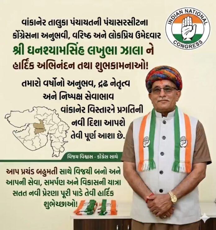 આગામી વાંકાનેર તાલુકા પંચાયતની ચૂંટણીમાં પંચાસર બેઠક પર ભારે રાજકીય ગરમાવો જોવા મળી રહ્યો છે, આ ચુંટણીમાં કોંગ્રેસ પાર્ટી દ્વારા વઘાસીયા ગામના અનુભવી, વરિષ્ઠ અને અત્યંત લોકપ્રિય નેતા ઘનશ્યામસિંહ લખુભા ઝાલા (ઉર્ફે ઘનુભા) ને મેદાનમાં ઉતારવામાં આવ્યા છે. તેમના ચૂંટણી જંગમાં ઝંપલાવવાથી સ્થાનિક મતદારોમાં ભારે ઉત્સાહ જોવા મળી રહ્યો છે અને પંચાસર બેઠક પર કોંગ્રેસનો વિજય લગભગ નિશ્ચિત મનાઈ રહ્યો છે….