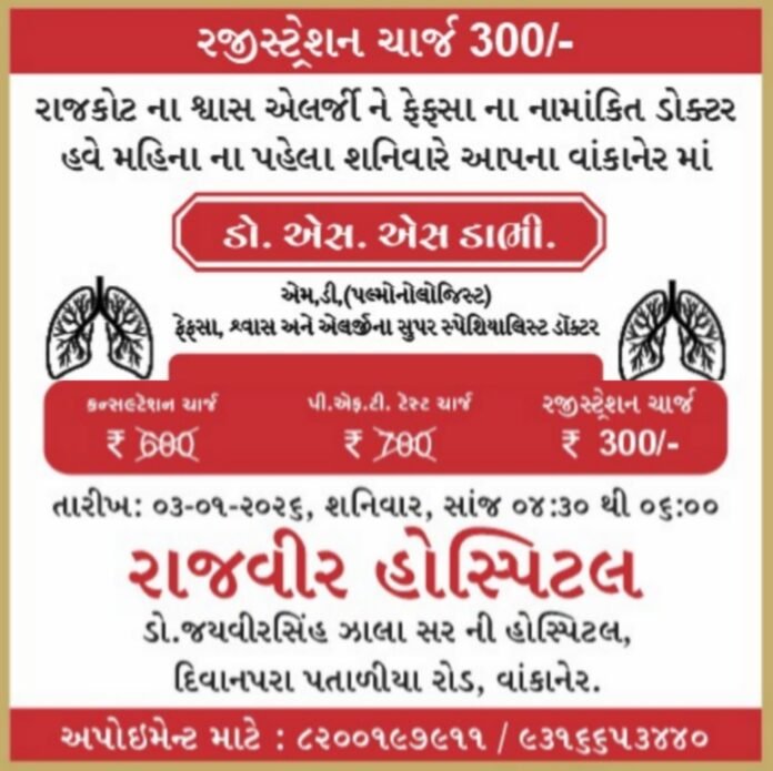 વાંકાનેરની રાજવીર હોસ્પિટલ ખાતે આગામી શનિવારે રાજકોટના શ્વાસ, એલર્જી તથા ફેફસાંના રોગોના નિષ્ણાંત ડોક્ટરની ખાસ ઓપીડી યોજાશે…..
