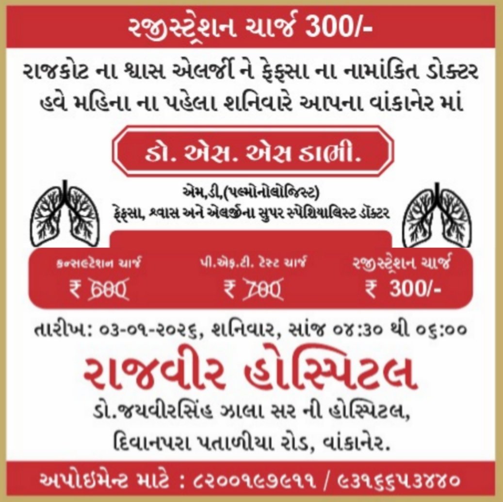 વાંકાનેર ખાતે ડો. જયવિરસિંહ ઝાલાની રાજવીર હોસ્પિટલ ખાતે આગામી શનિવારે રાજકોટના શ્વાસ, એલર્જી તથા ફેફસાંના રોગોના નિષ્ણાંત ડો. એસ. એસ. ડાભી (એમ.ડી., પલ્મોનોલોજીસ્ટ) ની ખાસ ઓપીડી નું આયોજન કરવામાં આવ્યું હોય, જેમાં શ્વાસ, એલર્જી તથા ફેફસાંના દરેક રોગોનું સચોટ નિદાન તથા સારવાર કરવામાં આવશે….