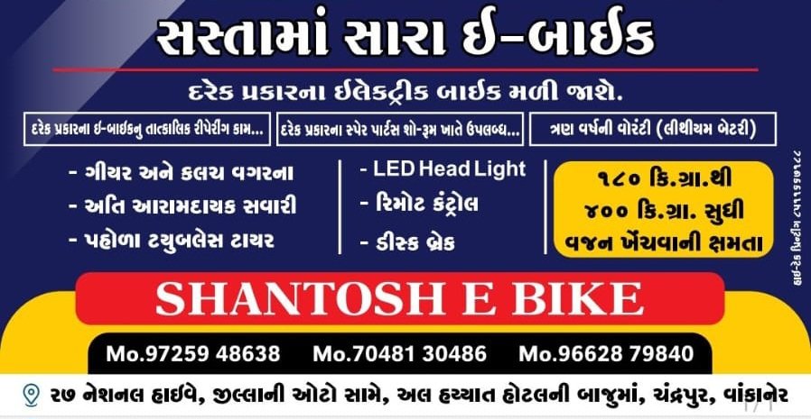 વાંકાનેર શહેર નજીક ચંદ્રપુર પાસે આજથી ઇ-બાઇકના વિશાળ શોરૂમ એવા સંતોષ ઇ-બાઇકનો પ્રારંભ થયો છે, જેમાં અહીં વાંકાનેર વિસ્તારમાં સૌપ્રથમ વખત ધોરણ 11-12 તથા કોલેજના વિદ્યાર્થીઓ માટે રૂ. 12,000 સબસિડી સાથે ઇ-બાઇક મળી રહેશે તેમજ નવા ઇ-બાઇક સાથે જુના બાઈક એક્સચેન્જ, સ્પેર પાર્ટસ તથા રિપેરિંગ સહિત ઇ-બાઇકને લગતું ટોટલ સોલ્યુશન અહીં મળી રહેશે ….