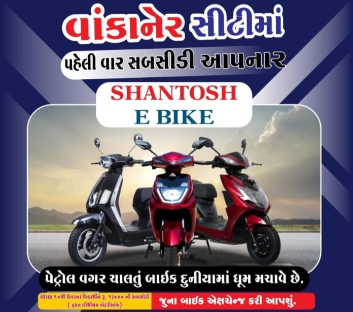 વાંકાનેર શહેર નજીક ચંદ્રપુર પાસે આજથી ઇ-બાઇકના વિશાળ શોરૂમ એવા સંતોષ ઇ-બાઇકનો પ્રારંભ થયો છે, જેમાં અહીં વાંકાનેર વિસ્તારમાં સૌપ્રથમ વખત ધોરણ 11-12 તથા કોલેજના વિદ્યાર્થીઓ માટે રૂ. 12,000 સબસિડી સાથે ઇ-બાઇક મળી રહેશે તેમજ નવા ઇ-બાઇક સાથે જુના બાઈક એક્સચેન્જ, સ્પેર પાર્ટસ તથા રિપેરિંગ સહિત ઇ-બાઇકને લગતું ટોટલ સોલ્યુશન અહીં મળી રહેશે ….