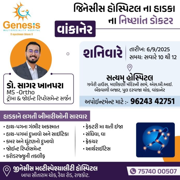 વાંકાનેરની સત્યમ્ હોસ્પિટલ ખાતે આવતીકાલ શનિવારે રાજકોટની નામાંકિત જિનેસીસ હોસ્પિટલના હાડકાંના નિષ્ણાત ટ્રોમા & જોઇન્ટ રિપ્લેસમેન્ટ સર્જન ડો. સાગર ખાનપરાની ઓપીડીનું આયોજન કરવામાં આવ્યું હોય, જેમાં દર્દીઓને હાડકાંને લગતાં તમામ પ્રકારના રોગોનું સચોટ નિદાન અને સારવાર કરવામાં આવશે, જેથી આ ઓપીડીનો દર્દીઓએ અચૂક લાભ લેવો….