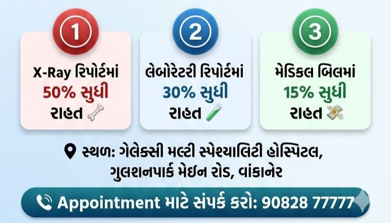 વાંકાનેરની નામાંકિત ગેલેક્સી મલ્ટી સ્પેશિયાલિટી હોસ્પિટલ ખાતે આજરોજ મંગળવારે ફ્રી ઓપીડી સેવા કેમ્પનું આયોજન કરવામાં આવ્યું છે, જેમાં હોસ્પિટલમાં કાર્યરત ઓર્થોપેડીક (હાડકાં) વિભાગ, ગાયનેક વિભાગ તથા ડેન્ટલ વિભાગ વિભાગમાં તમામ દર્દીઓને ઓપીડી સેવાઓનો લાભ મળી રહેશે….