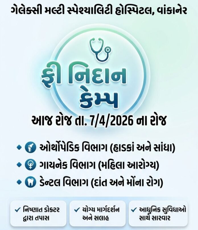 વાંકાનેરની નામાંકિત ગેલેક્સી મલ્ટી સ્પેશિયાલિટી હોસ્પિટલ ખાતે આજરોજ મંગળવારે ફ્રી ઓપીડી સેવા કેમ્પનું આયોજન કરવામાં આવ્યું છે, જેમાં હોસ્પિટલમાં કાર્યરત ઓર્થોપેડીક (હાડકાં) વિભાગ, ગાયનેક વિભાગ તથા ડેન્ટલ વિભાગ વિભાગમાં તમામ દર્દીઓને ઓપીડી સેવાઓનો લાભ મળી રહેશે….